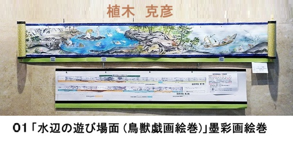 01 植木克彦 「水辺の遊び場面 (鳥獣戯画絵巻)」 墨彩画 絵巻